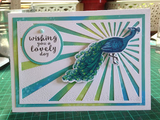 This is a card I made for the lovely Angie. You can find her blog here and she is also the very talented lady who designed my blog header 😀 Anyway used one of the items I purchased at the Taunton craft show to make this card. I made a background using distress oxide inks, die cut the "Ray of light" die and layered up. Coloured the peacock using layers of hero arts inks and diecut and stamped sentiment and also layered up.